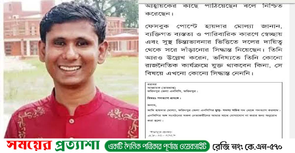 পদত্যাগ করলেন ফরিদপুরে এনসিপি জেলা কমিটির যুগ্ম সদস্য সচিব হায়দার মোল্যা