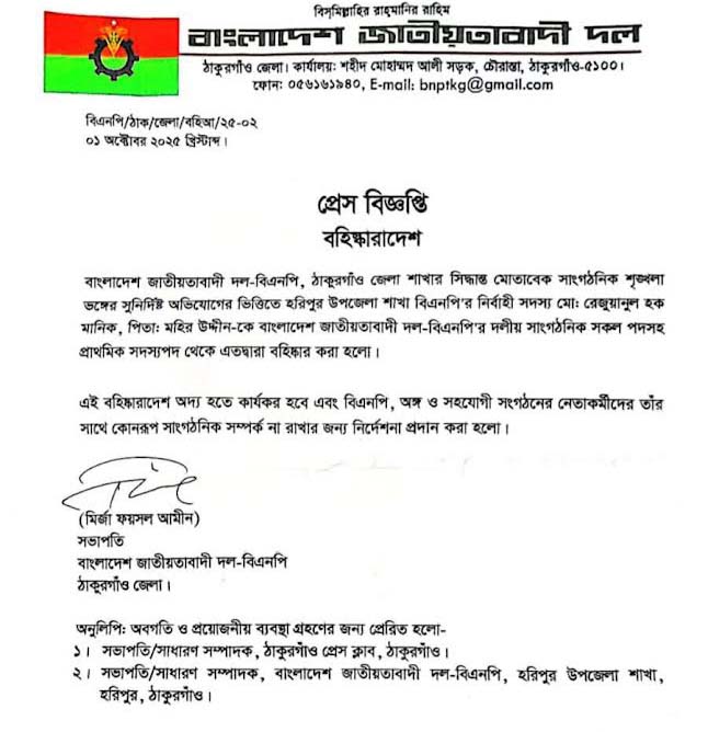 ১ অক্টোবর বুধবার বাংলাদেশ জাতীয়তাবাদী দল বিএনপি ঠাকুরগাঁও জেলা শাখার সভাপতি মির্জা ফয়সাল আমিনের এক পেশ বিজ্ঞপ্তিতে এই বহিষ্কারাদেশ থেকে জানা যায়।