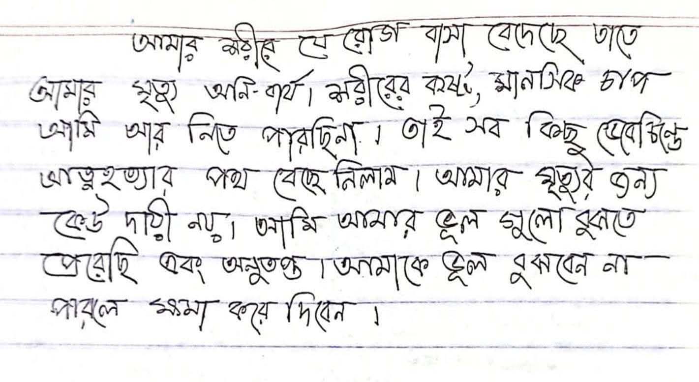 ঝালকাঠিতে শামিম হোসেন জয় নামে (৩৬) এক আইনজীবী গলায় ফাঁস দিয়ে আত্মহত্যা করেছেন। আত্মহত্যার আগে তিনি একটি চিরকুট লিখে রেখে গেছেন। তাতে লেখা-আমার শরীরে যে রোগ বাসা বেধেছে তাতে আমার মৃত্যু অনিবার্য। শরীরের কষ্ট, মানসিক চাপ আমি আর নিতে পারছিনা। তাই সব কিছু ভেবেচিন্তে আত্মহত্যার পথ বেছে নিলাম। আমার মৃত্যুর জন্য কেউ দায়ী নয়। আমি আমার ভুল গুলো বুঝতে পেরেছি এবং অনুতপ্ত। আমাকে ভুল বুঝবেন না পারলে ক্ষমা করে দিবেন।