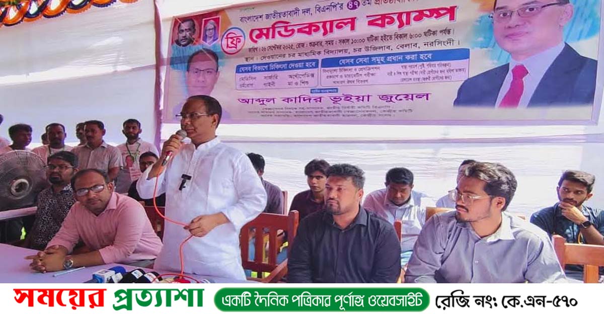 বাংলাদেশ জাতীয়তাবাদী দল বিএনপি’র ৪৭তম প্রতিষ্ঠাবার্ষিকী উপলক্ষে নরসিংদীর বেলাবতে ফ্রি মেডিকেল ক্যাম্পের আয়োজন করে বিনামূল্যে চিকিৎসা ও ওষুধ বিতরণ করা হয়। আজ (২৭ সেপ্টেম্বর) শুক্রবার সকালে চর উজিলাব ইউনিয়নের দেওয়ানের চর উচ্চ বিদ্যালয় মাঠে এই ক্যাম্পের উদ্বোধন করেন বিএনপির সহ-স্বেচ্ছাসেবক বিষয়ক সম্পাদক ও বেলাব-মনোহরদীর ধানের শীষের মনোনয়ন প্রত্যাশী আব্দুল কাদির ভূইয়া জুয়েল।