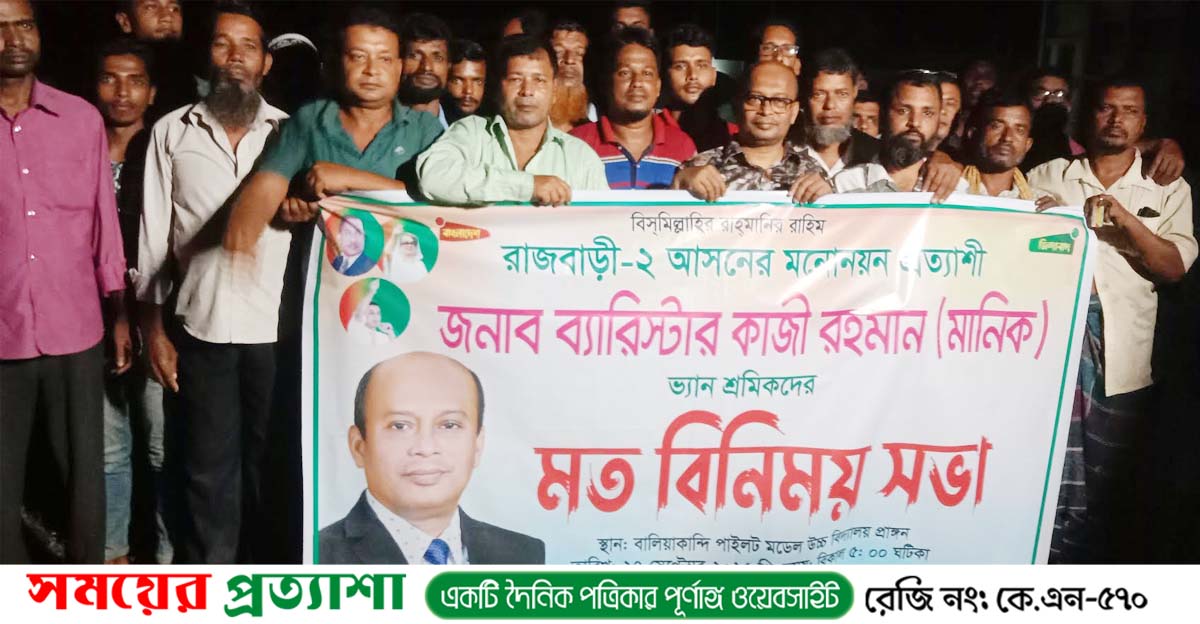 রাজবাড়ীর বালিয়াকান্দিতে রাজবাড়ী ২ আসনে বিএনপির মনোনয়ন প্রত্যশী( বালিয়াকান্দি, কালুখালী ও পাংশা ) এর মনোনয়ন প্রত্যাশী জাতীয়তাবাদী স্বেচ্ছাসেবক দলের কেন্দ্রিয কমিটির সাবেক যুগ্ন সাধারণ সম্পাদক ও সহাকারি এ্যাটোনি জেনারেল ব্যারিস্টার কাজী রহমান মানিক ‘ভ্যানচালকদের সাথে মতবিনিময় করেছেন। ২৭ সেপ্টেম্বর শনিবার বিকালে বালিয়াকান্দি পাইলট উচ্চ ‘বিদ্যালয়ের এমতবিনিময় সভা অনুষ্ঠিত হয়।