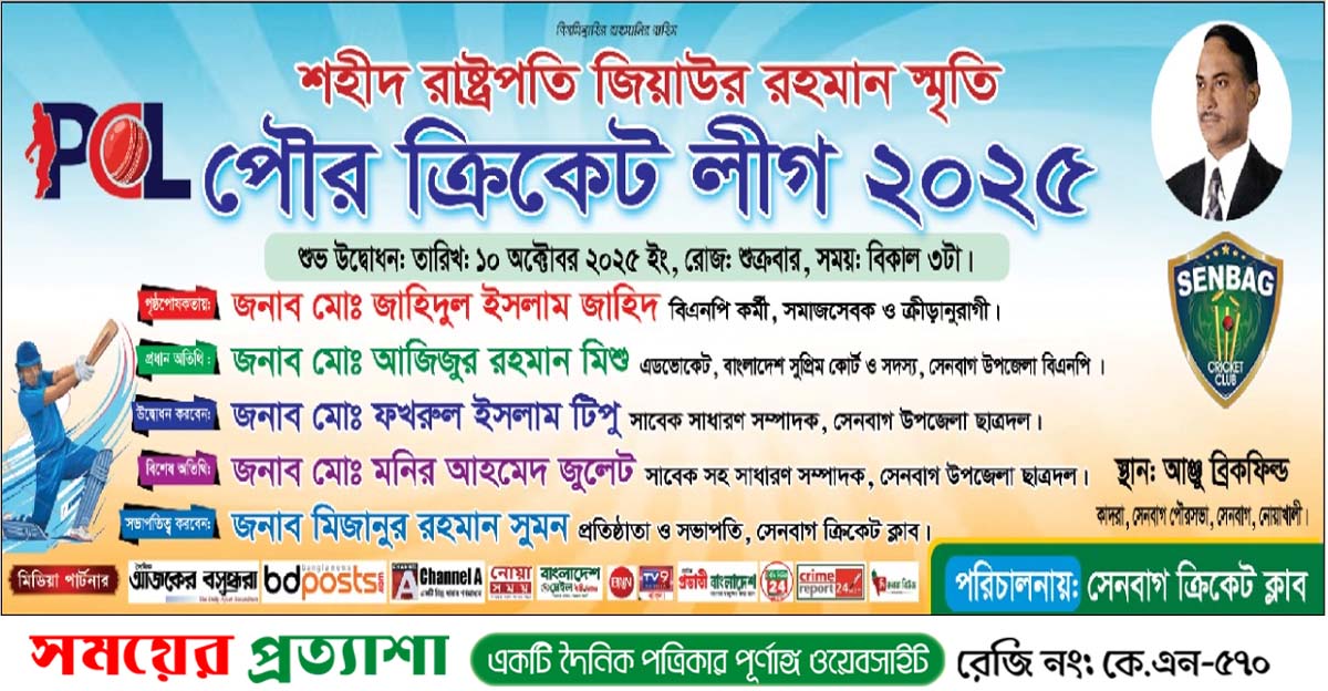 নোয়াখালীর সেনবাগে শুরু হতে যাচ্ছে বহুল প্রতীক্ষিত “শহীদ রাষ্ট্রপতি জিয়াউর রহমান স্মৃতি (PCL) পৌর ক্রিকেট লীগ ২০২৫”। আগামী শুক্রবার, ১০ অক্টোবর ২০২৫, বিকাল ৩টা, সেনবাগ পৌরসভার কাদরা আঞ্জু ব্রিকফিল্ড মাঠে বর্ণাঢ্য আয়োজনে টুর্নামেন্টের শুভ উদ্বোধন হবে।