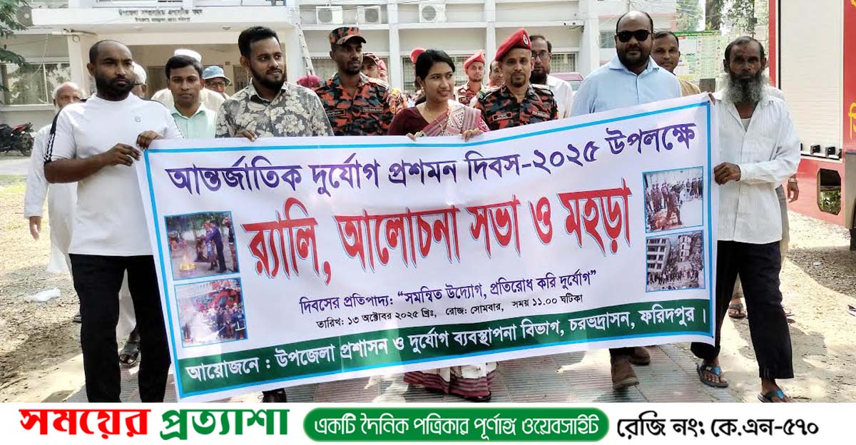 ফরিদপুরের চরভদ্রাসনে দুর্যোগ প্রশমন দিবস-২০২৫ উদ্যাপন উপলক্ষে র্যালি ও আলোচনা সভা অনুষ্ঠিত হয়েছে। “সমন্বিত উদ্যোগ, প্রতিরোধ করি দুর্যোগ” এই প্রতিপাদ্য নিয়ে সোমবার(১৩ অক্টবর)সকাল সাড়ে ১১টার দিকে উপজেলা পরিষদ চত্বর থেকে একটি র্যালি বের হয়ে একই স্থানে এসে শেষ হয়। পরে পরিষদ চত্বরে অগ্নিকান্ড ও ভূমিকম্প বিষয়ক মহড়ায় অংশ নেন ফায়ার সার্ভিস কর্মীরা।