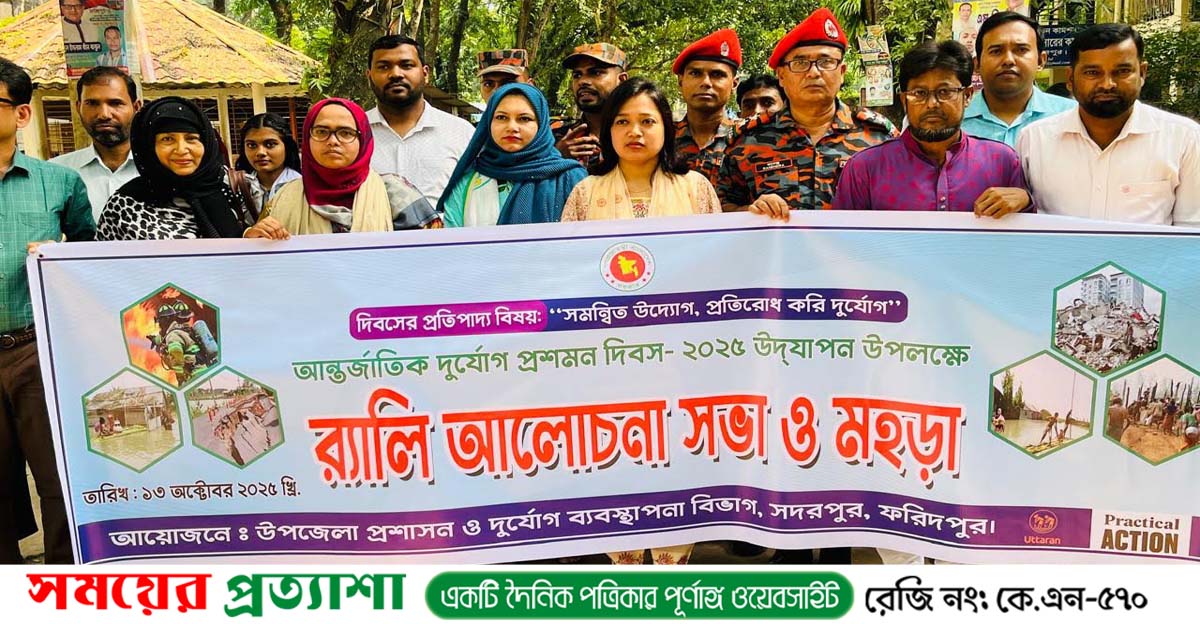 ফরিদপুরের সদরপুরে আন্তর্জাতিক দুর্যোগ প্রশমন দিবস ২০২৫ইং উপলক্ষে র্যালি, আলোচনা ও দুর্যোগ প্রশমন বিষয়ক মহড়া প্রদর্শিত হয়েছে। সোমবার (১৩ অক্টোবর) সকাল ১১ টায় উপজেলা পরিষদ চত্বরে একটি র্যালি বের করা হয়। এতে সভাপতিত্ব করেন সদরপুর উপজেলা নির্বাহী অফিসার জাকিয়া সুলতানা।