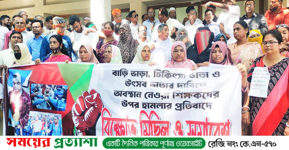 মূল বেতনের ২০ শতাংশ হারে বাড়ি ভাড়া ও ১৫০০ টাকা চিকিৎসা ভাতা প্রদানসহ চার দফা দাবি আদায়ের লক্ষ্যে মাগুরার মহম্মদপুরে বিক্ষোভ মিছিল ও সমাবেশে করেছেন বেসরকারি এমপিওভুক্ত স্কুল, কলেজ, মাদ্রাসা ও কারিগরির শিক্ষক-কর্মচারীরা।