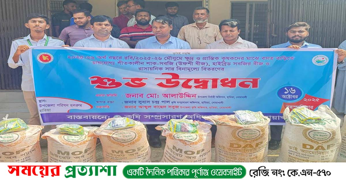 নোয়াখালী জেলার বিছিন্ন দ্বীপ উপজেলা হাতিয়া ২০২৫-২৬ অর্থবছরে রবি মৌসুমে ক্ষুদ্র ও প্রান্তিক কৃষকদের মাঝে বসতবাড়িতে চাষযোগ্য শীতকালীন শাক-সবজির (উফশী ও হাইব্রিড বীজ) এবং রাসায়নিক সার বিনামূল্যে বিতরণ কার্যক্রমের শুভ উদ্বোধন করা হয়েছে।