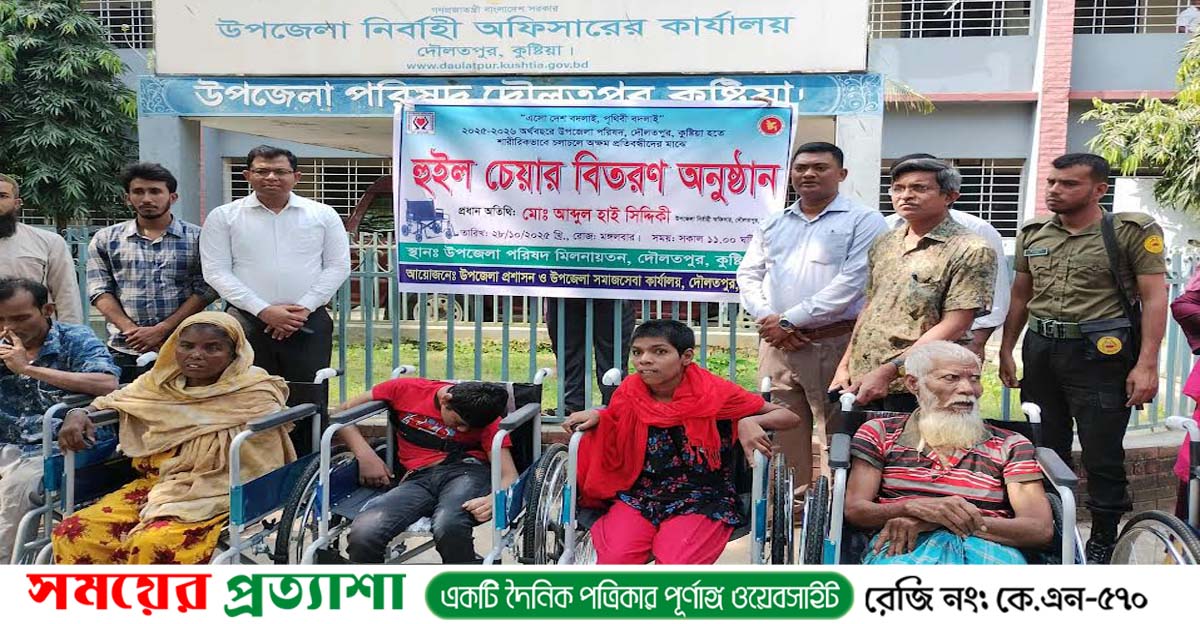 কুষ্টিয়ার দৌলতপুর উপজেলা প্রশাসন ও সমাজসেবা অধিদপ্তরের যৌথ উদ্যোগে এসো দেশ বদলাই,পৃথিবী বদলাই এই প্রতিপাদ্যকে সামনে রেখে ২০২৫-২৬ অর্থবছরে উপজেলা পরিষদ কতৃক শারীরিকভাবে চলাচলে অক্ষম প্রতিবন্ধীদের মাঝে হুইল চেয়ার বিতরণ করা হয়েছে।