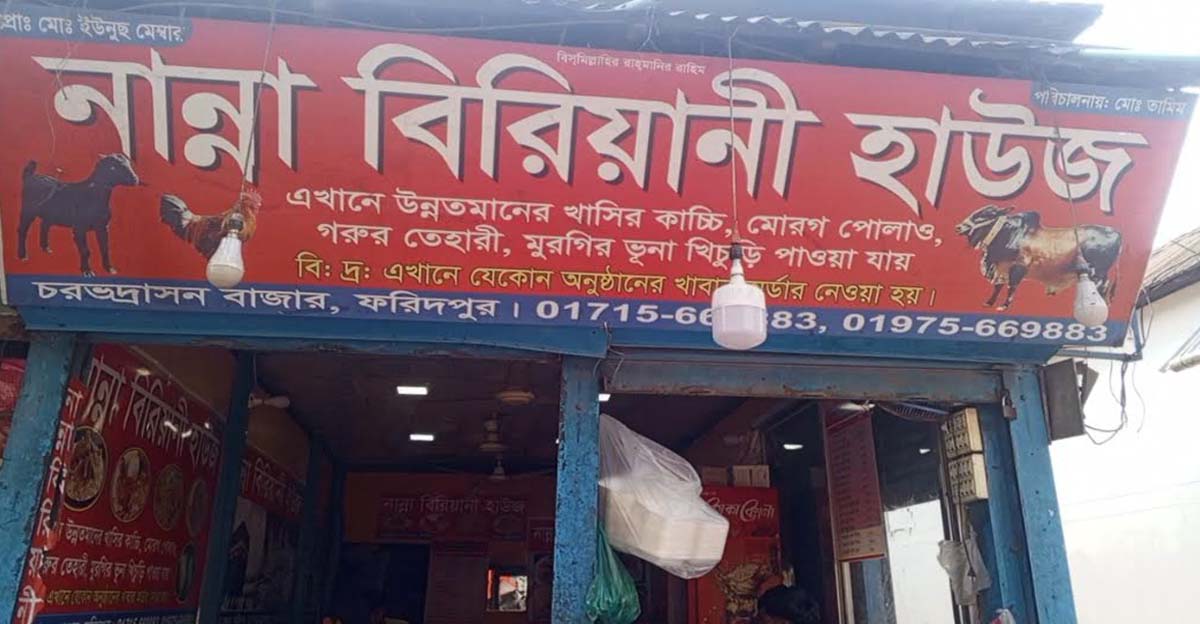 ফরিদপুরের চরভদ্রাসনে উপজেলা সহকারী কমিশনার (ভূমি) কার্যালয়ের সামনে ‘হাজী বিরানি হাউজ ’ এবং উপজেলা পরিষদ মার্কেট সংলগ্ন ‘নান্না বিরিয়ানি হাউজ ’ নাম ব্যবহার করে দুটি ভুয়া প্রতিষ্ঠান দীর্ঘদিন ধরে প্রকাশ্যে প্রতারণা চালিয়ে আসছে। ব্র্যান্ডের জনপ্রিয়তা ভাঙিয়ে তারা নিম্নমানের ও ঝুঁকিপূর্ণ খাদ্য সরবরাহ করছে। এতে জনস্বাস্থ্যের জন্য গুরুতর হুমকি তৈরি হয়েছে। ভোক্তাদের অভিযোগ, প্রশাসনের শিথিল নজরদারিই এই অবৈধ ব্যবসাকে আরও বেপরোয়া করে তুলেছে।
